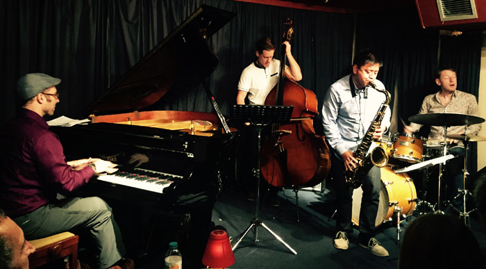 I’ve heard drummer Andrew Bain many times in other people’s bands but never as a leader. And what a band to lead! On piano was Gwilym Simcock, on bass Steve Watts, on tenor and soprano saxophones Iain Dixon, and on guitar Mike Walker.